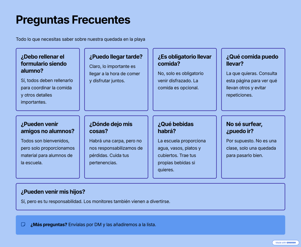 Esto es una quedada no una clase de surf, aquí el que viene lo hace bajo su propia responsabilidad, la idea es que nos juntemos todos los que queramos pasar un rato divertido.